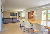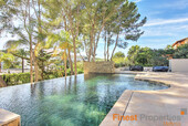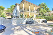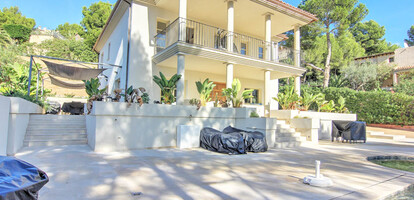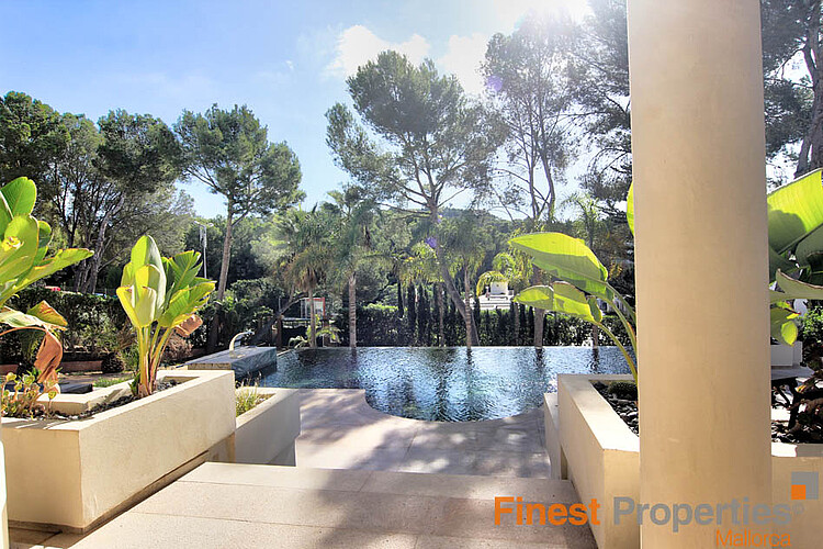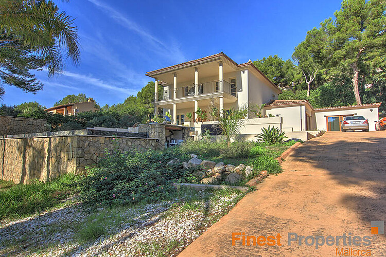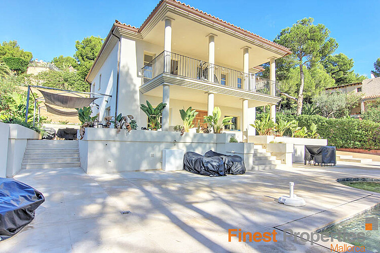 Die Costa de la Calma ist eine Residente Wohnlage zwischen Santa Ponsa und Paguera im Südwesten Mallorcas mit guter Anbindung nach Palma. Das Haus wurde 2001 auf einem ca 2.000m² grossen Grundstück erstellt und 2023 renoviert. Die ca 380m² konstruierte Fläche verteilt sich auf 2 Wohnetagen. Im EG hat es ein Wohn-Esszimmer mit offener Küche, ein Gäste WC, ein Gäste Apartment mit kleiner Küchenzeile und Badezimmer sowie Zugang zu einem Büroraum. Im 1. OG hat es ein Mastersuite mit Ankleide, ein Schlafzimmer mit Bad en Suite, ein weiteres Schlafzimmer und ein Badzimmer mit Wanne. Im Außenbereich hat es noch einen 8x5m Überlaufpool umgeben mit offenen und überdachten Terrassen. Zur Ausstattung gehören Natursteinböden, Klimaanlage w/k, Gaszentralheizung (Radiatoren).