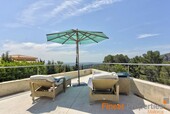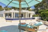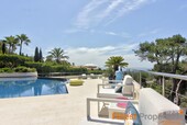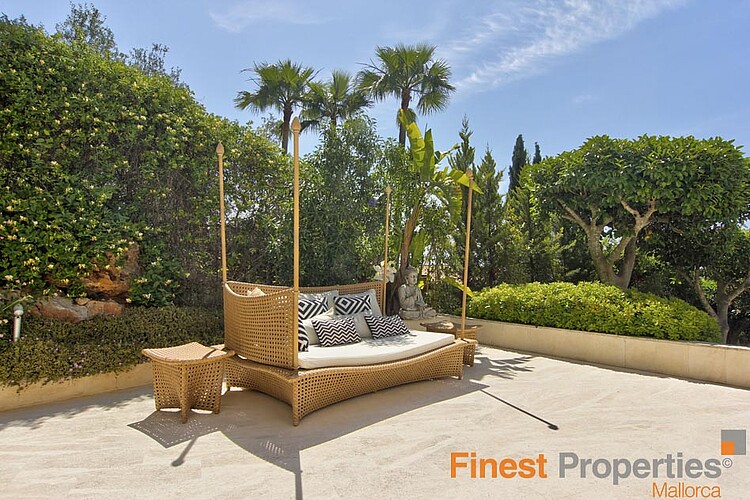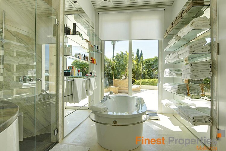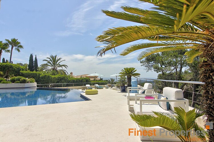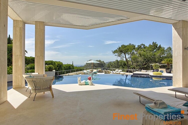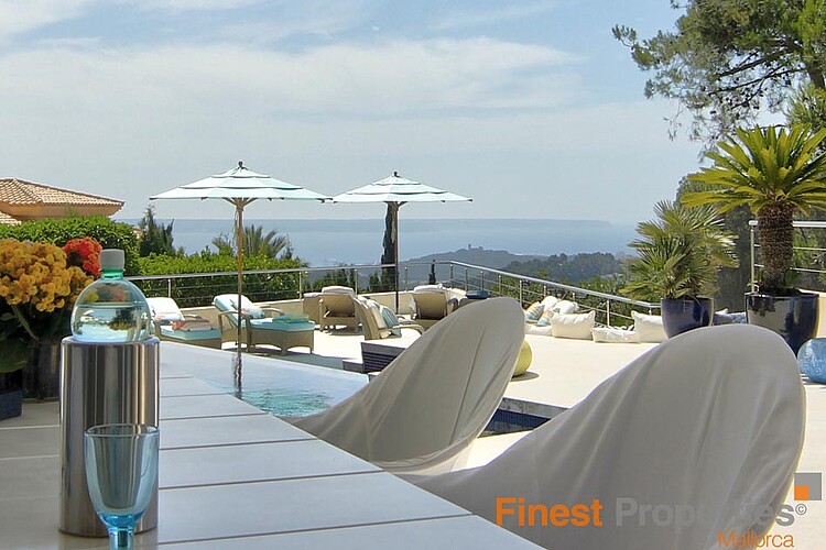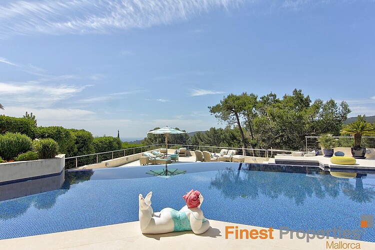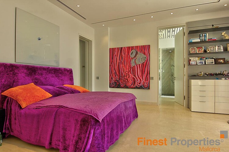 Die Luxuriöse und bewachte Wohnlage von Son Vida liegt nur 3km von Palma entfernt und ist umgeben von 3 Golfplätzen und zwei 5 Sterne Hotels. Diese moderne Villa wurde mit hochwertigen Materialien auf einem ca 2.350m² großen Hanggrundstück erstellt. Die ca 650m² Wohnfläche verteilt sich auf 2 Wohnebenen. Der Eingang befindet sich im EG. In der nach oben offen gestalteten Eingangshalle erreicht man über eine elegant angelegte Treppe, oder bequem mit dem Aufzug, das 1. OG. Hier befinden sich ein großzügiges und Licht durchflutetes Wohn-Esszimmer mit Blick auf die ca 300m große Terrasse und einem großen Pool. Imposant von hier ist sicherlich der wunderschöne Panoramablick bis Palma und das Meer. Auf dieser Ebene befinden sich noch eine moderne Küche mit Kochinsel, ( mit Weinkühlschrank, Gaggenau Backofen ect.), eine Bibliothek (TV Zimmer), das Hauptschlafzimmer mit 2 Ankleiden und einem Badezimmer und 3 weitere Gäste Schlafzimmer mit je einem Badezimmer en Suite. Im Außenbereich hat es offene und überdachte Terrassenbereiche mit diversen Sitzgruppen, eine Außen Dusche und Zugang zu einer 300m² großen Dachterrasse die man aber auch per Lift erreicht. Die Terrasse eignet sich hervorragend für Hausfeste oder einer Dachterrassenparty mit Freunden, die vom Panoramablick beeindruckt sein werden. Im EG befinden sich noch ein Büroraum, ein Meditationszimmer, ein Badezimmer mit WC und Dusche, eine überdachte Terrasse, ein Raum der sich als Sauna eignen würde und Technikräume. Für Gäste steht noch ein separates Gästeapartment ca 50m² mit Wohnzimmer, Küche, Sz und Badezimmer zur Verfügung. Zur Ausstattung gehören u.a. eine Fußbodenheizung (Öl), Klimaanlage w/k, Alu Panorama Schiebefenster, Scherengitter, Alarmanlage und Solaranlage für warm Wasser. 2 Autos finden Platz im überdachten Carport. Die Möbelübernahme sowie die Kunstgegenstände und Bilder von namhaften Künstlern ist verhandelbar